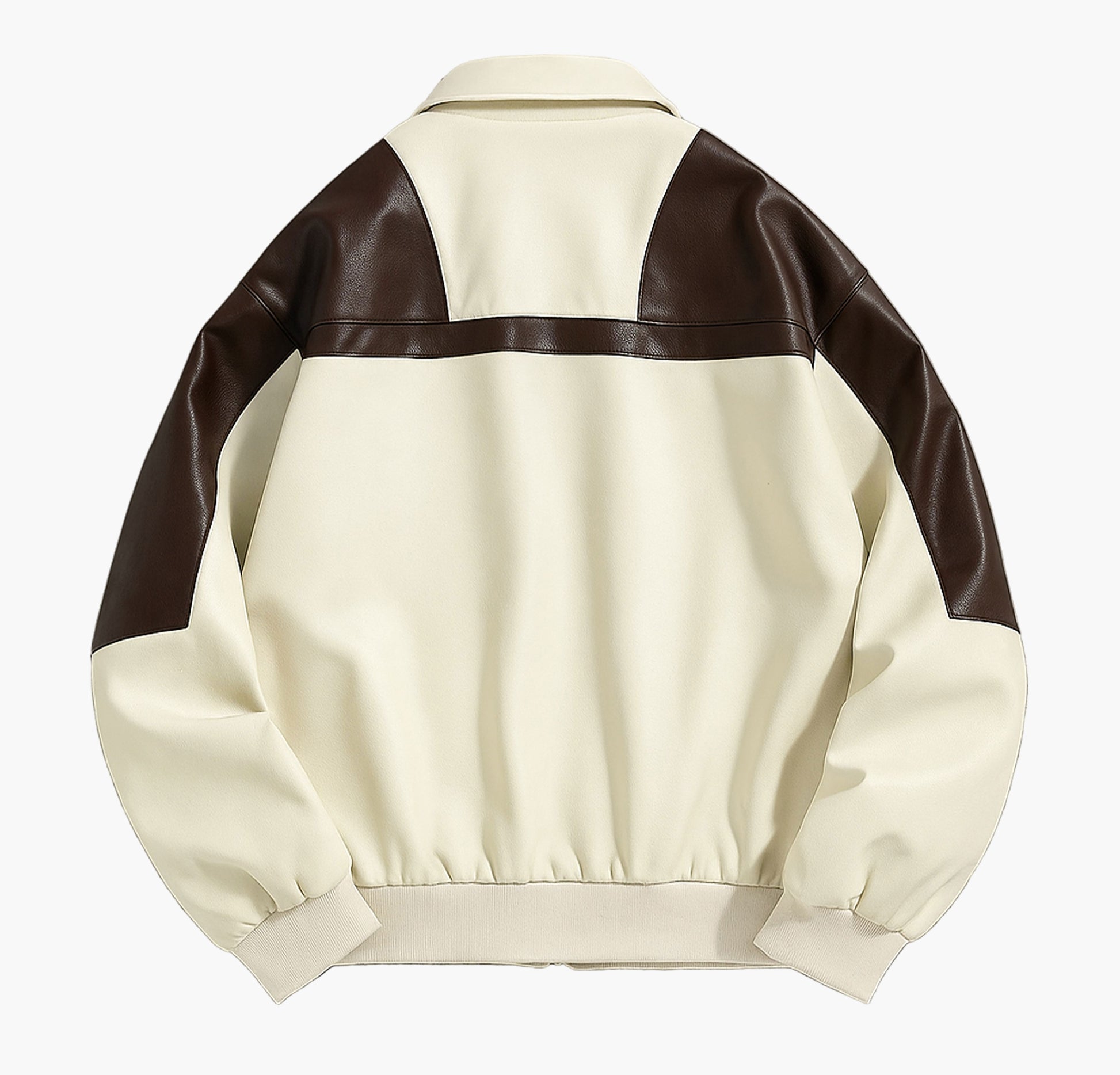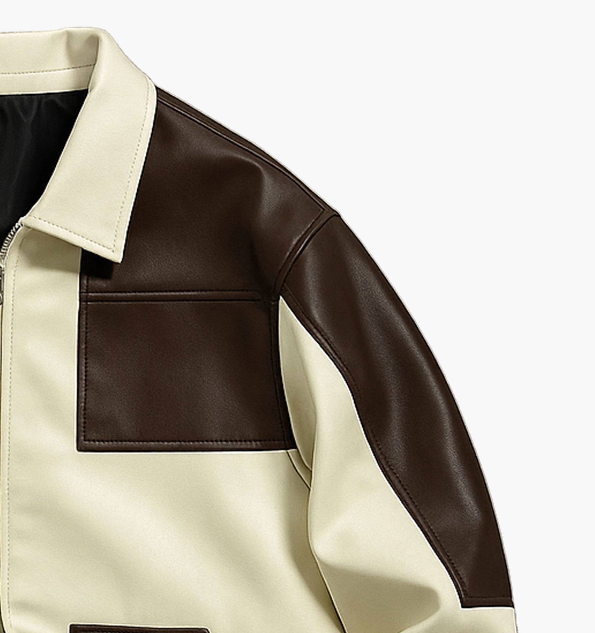 Men’s Faux Leather Colorblock Bomber Jacket – Beige & Brown Short Zip-Up