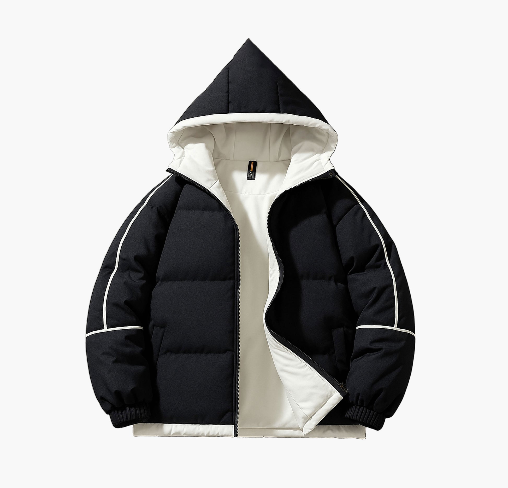 Men’s Hooded Winter Jacket – White & Black Zip-Up Coat with Insulated Fill