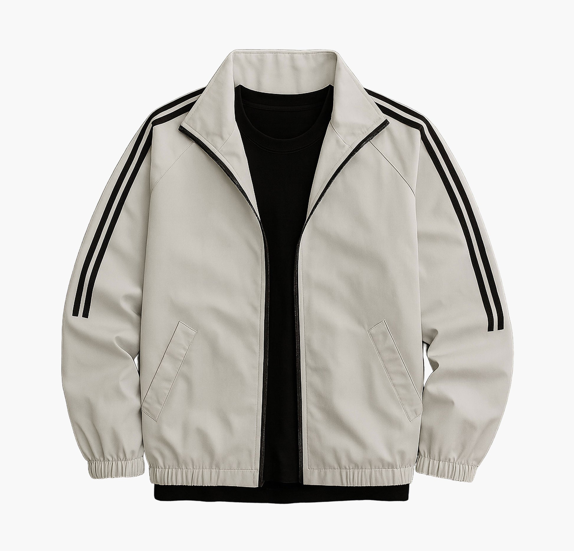 tand out in style with this men’s oversized lightweight jacket, designed with a pastel pink and black striped pattern and subtle white piping. Featuring a stand collar, relaxed fit, and zippered pockets, it blends minimalist design with modern streetwear flair. The wrinkle-resistant outer shell and breathable lining ensure comfort and easy care for everyday use.