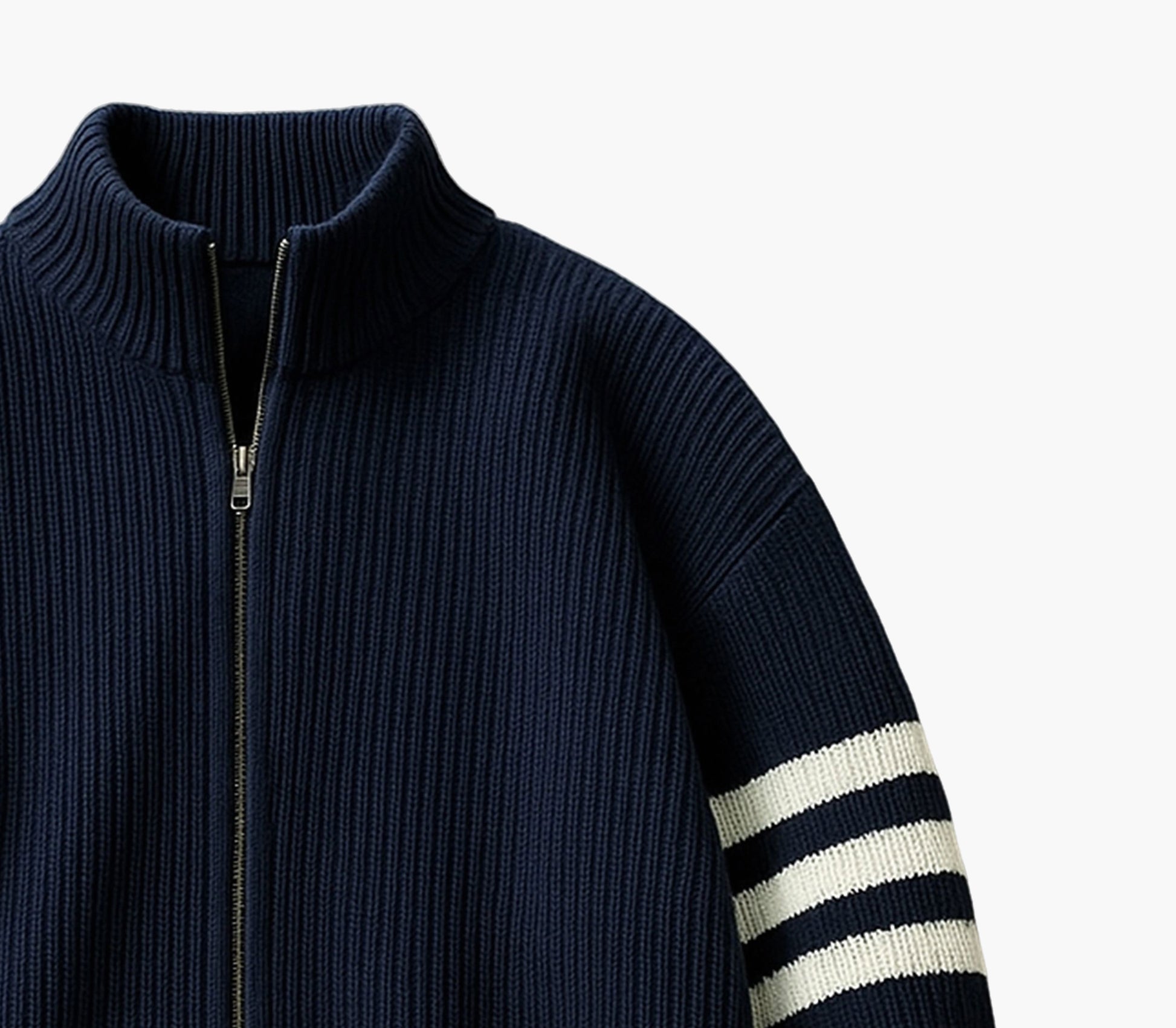 Crafted from premium fabric with horizontal stripe detailing, this versatile outerwear piece combines modern street style with classic knitwear appeal — perfect for layering or wearing on its own for a polished winter look.