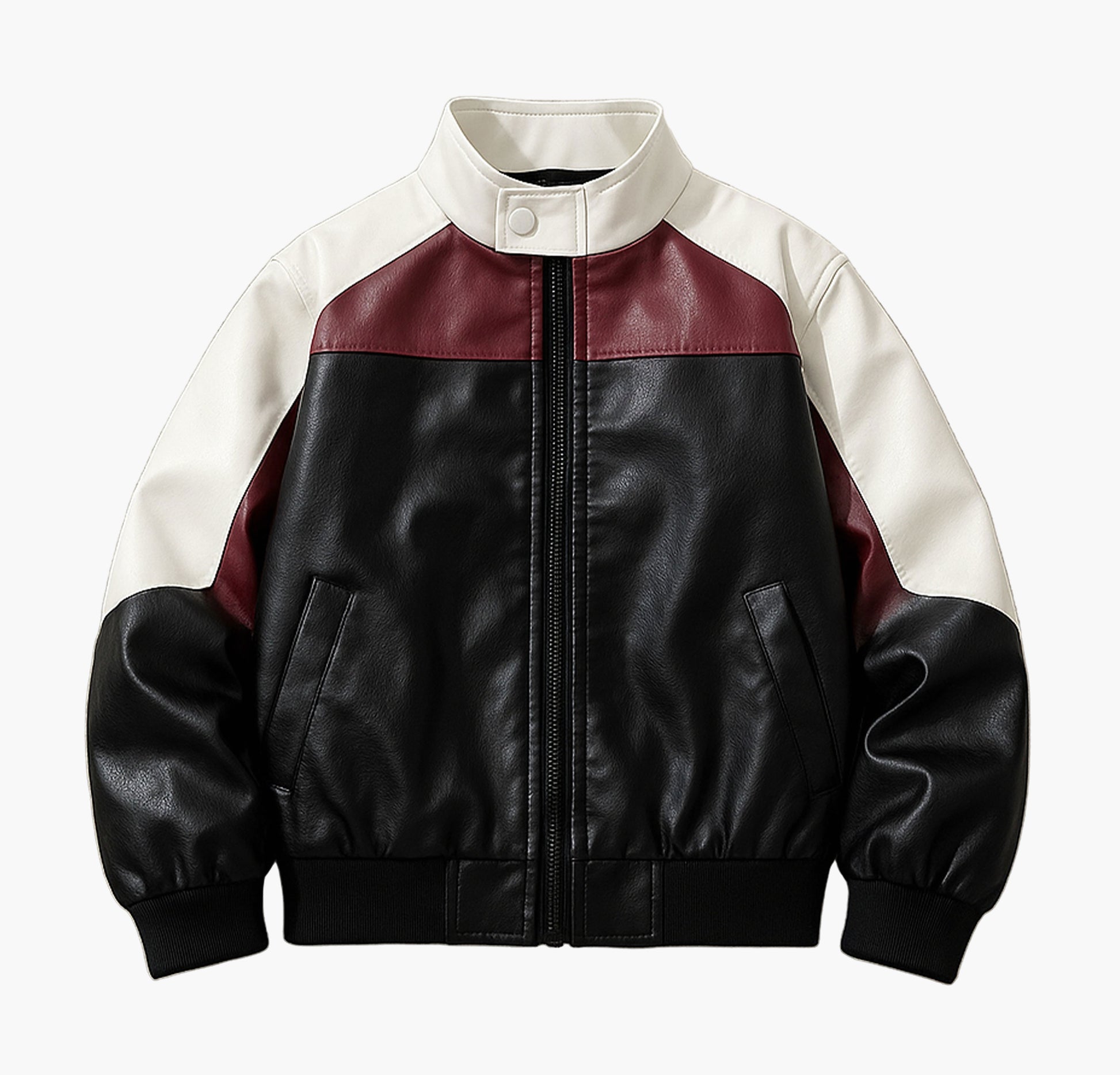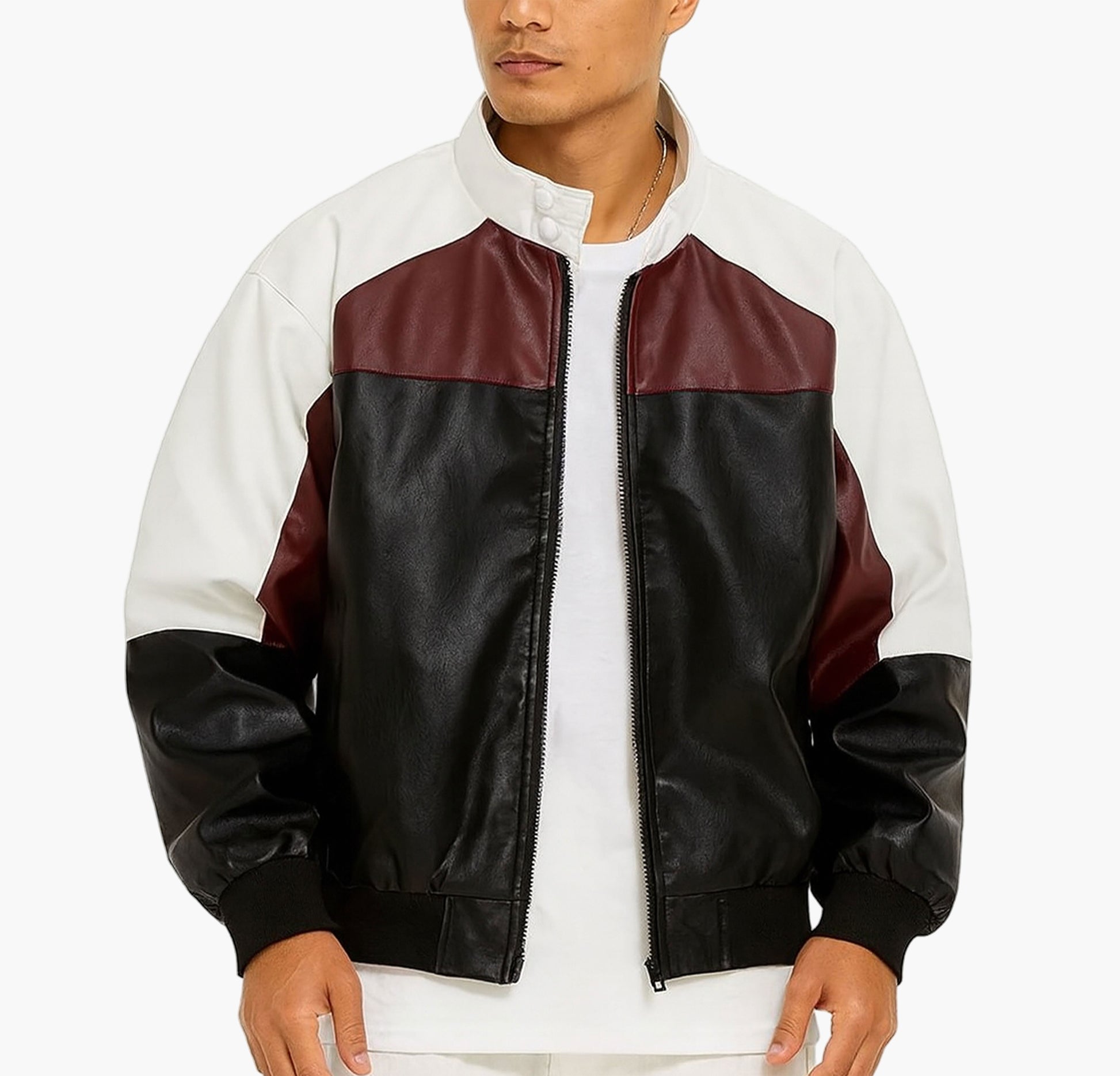 Men’s Street Style Bomber Jacket – Black, White & Red Color Block Zip-Up