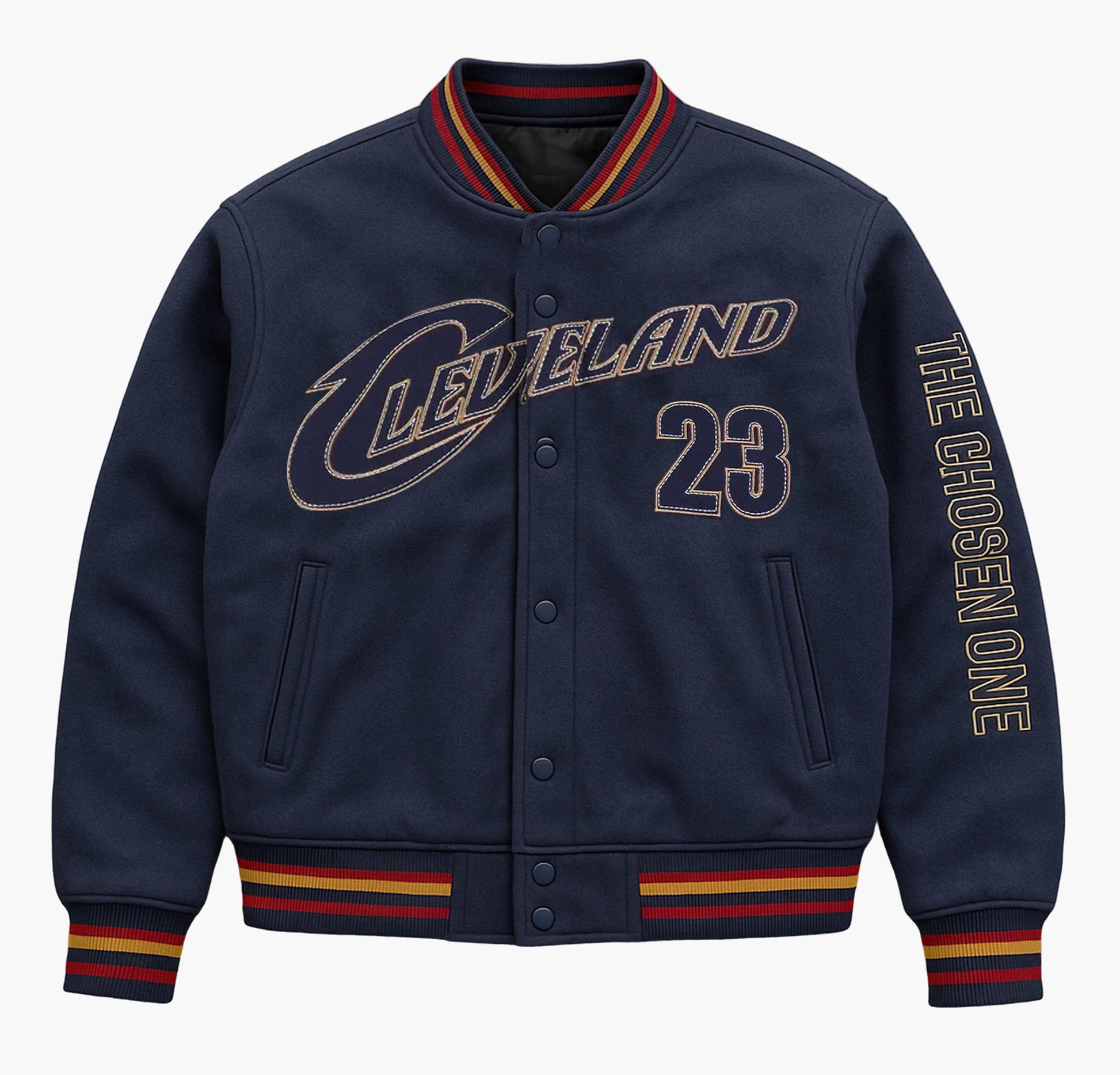 Show your team pride with this men’s varsity jacket featuring a bold Cleveland-inspired #23 emblem and athletic lettering. Designed with a zip-up front, stand collar, and relaxed fit, it blends comfort with a sporty, collegiate style.