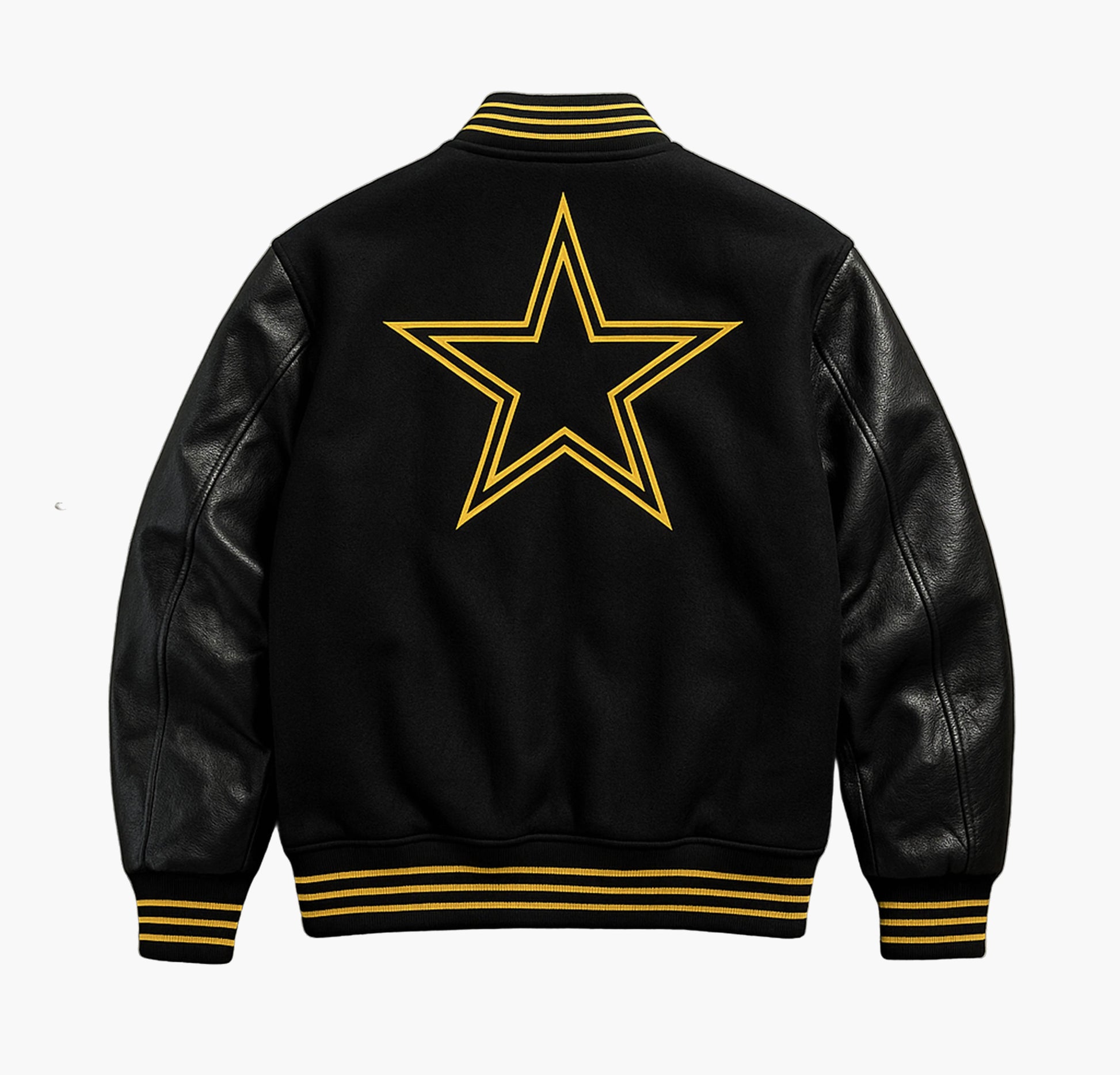 Bring standout energy to your look with this men’s varsity jacket featuring golden-toned sleeves and detailed star lettering embellishments. Designed with a full-zip closure and baseball collar, it combines classic college style with a bold modern twist.